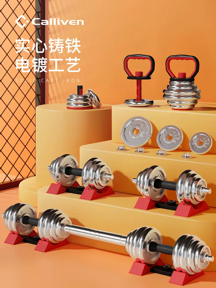 电镀哑铃男士健身家用20公斤30kg实心铁壶铃杠铃哑铃架可调节重量